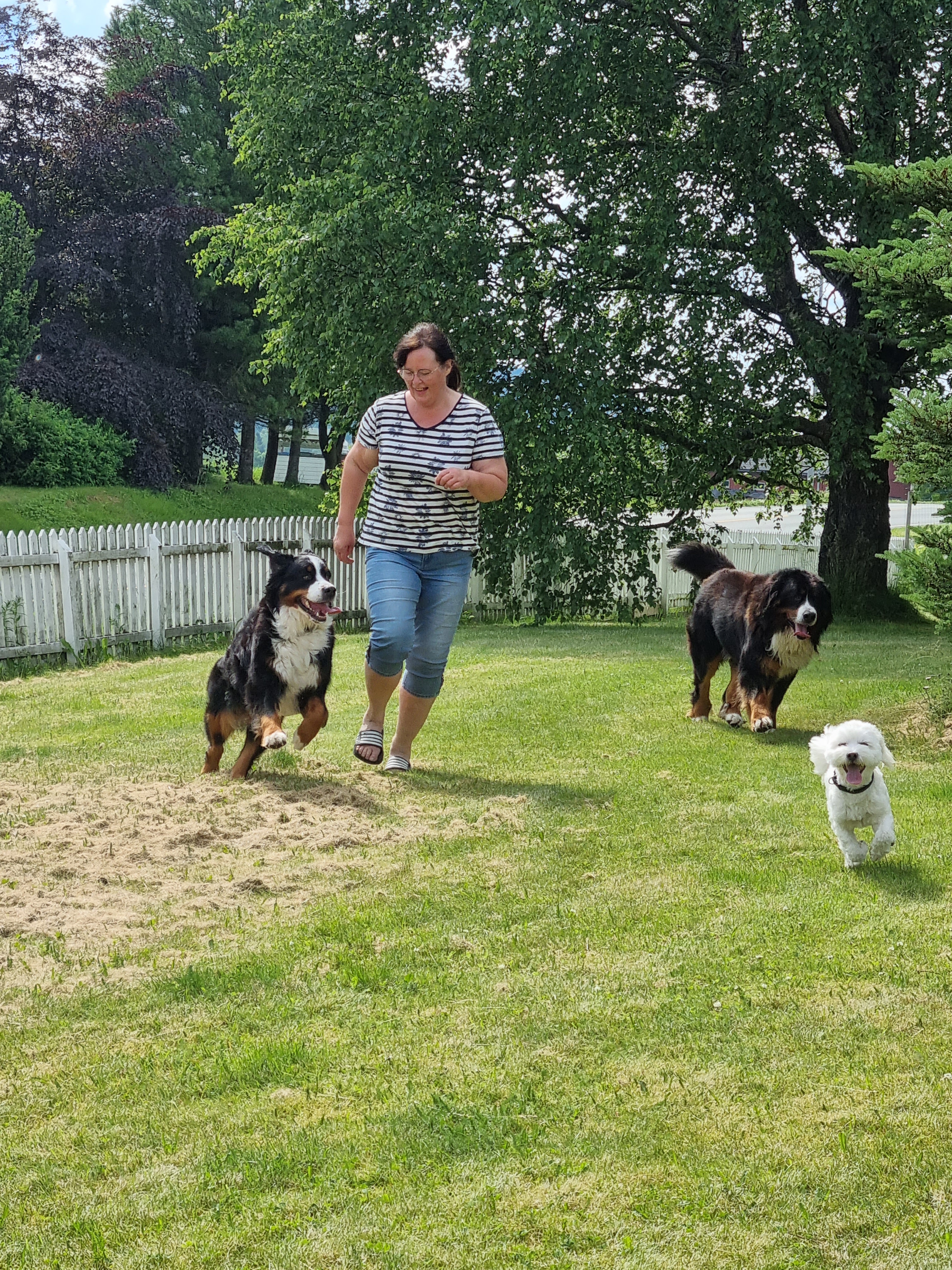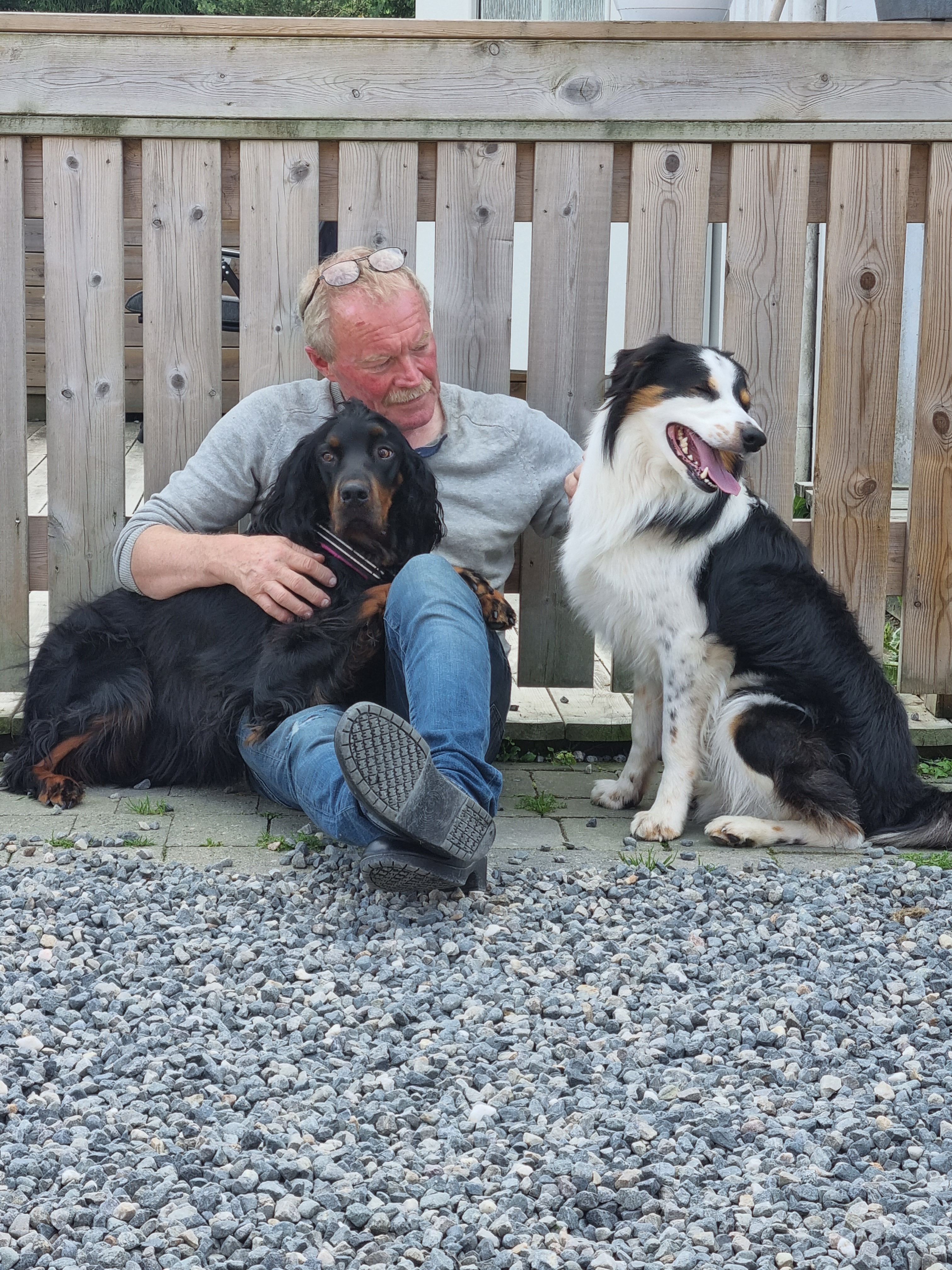 Vi har gjerdet inn hele eiendommen, så hundene har stor plass for å leke å springe på.