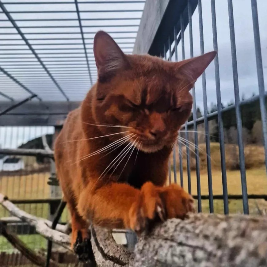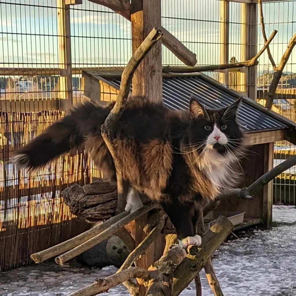 De har stort uteområde de kan bryne seg på, med kattehus, trær og planter. Inne får de gå løse om de vil, eller etter ønske fra eier.